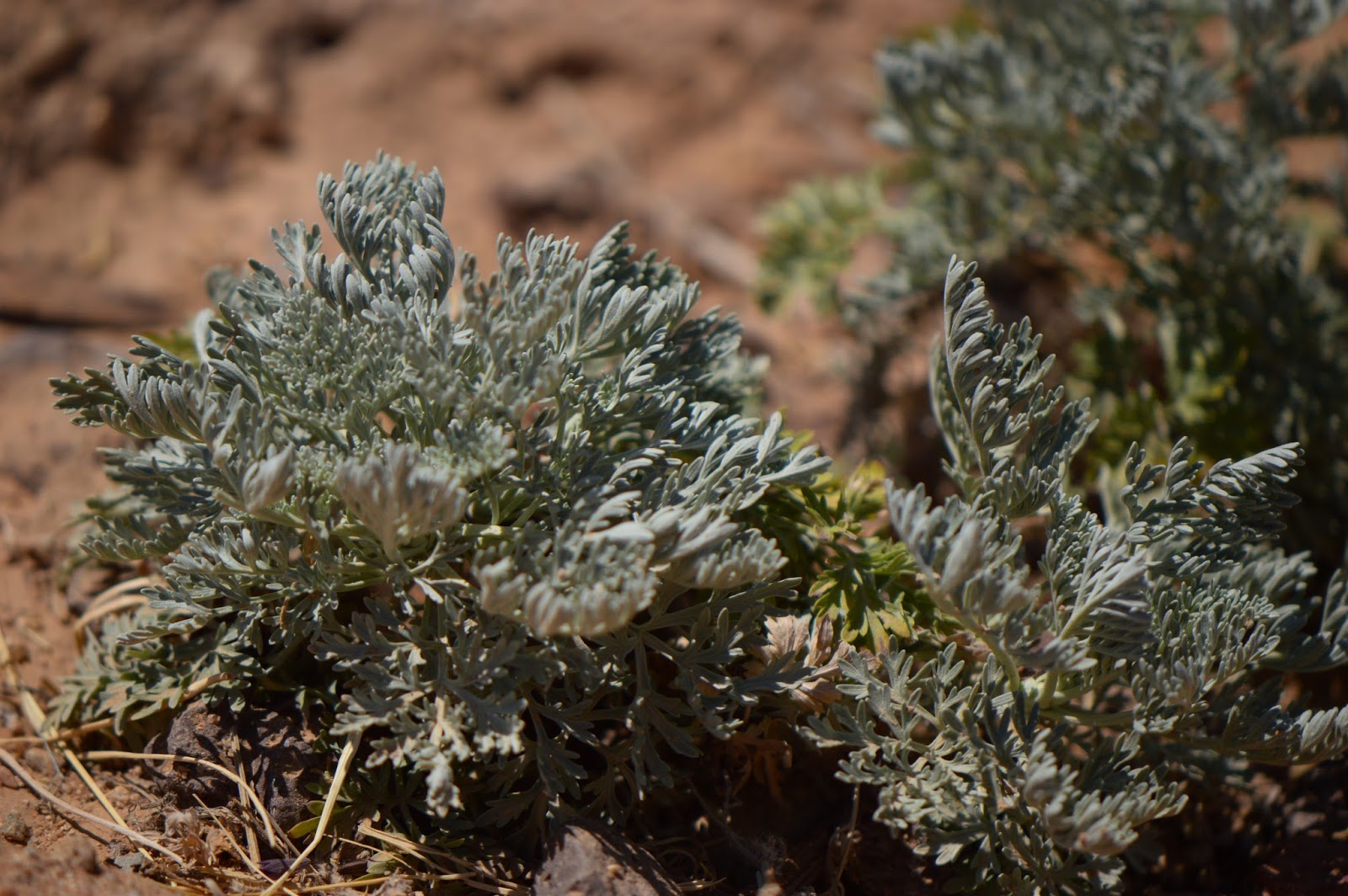 Another silver-leaved plant is Artemesia "Powis Castle". It is still very small, but I have great hopes for it and have it positioned to fill out the southeast corner. I was unsure of its capacity to survive here, but a look online at Dave's Garden shows reports of it thriving it such hell-hot places as Las Vegas, Nevada and Los Lunas, New Mexico, so probably it can take my Arizona location also. So far, at least...